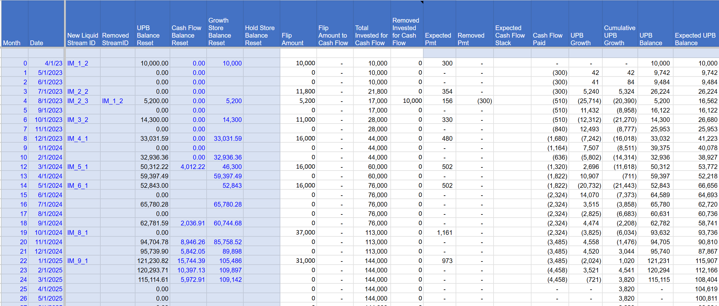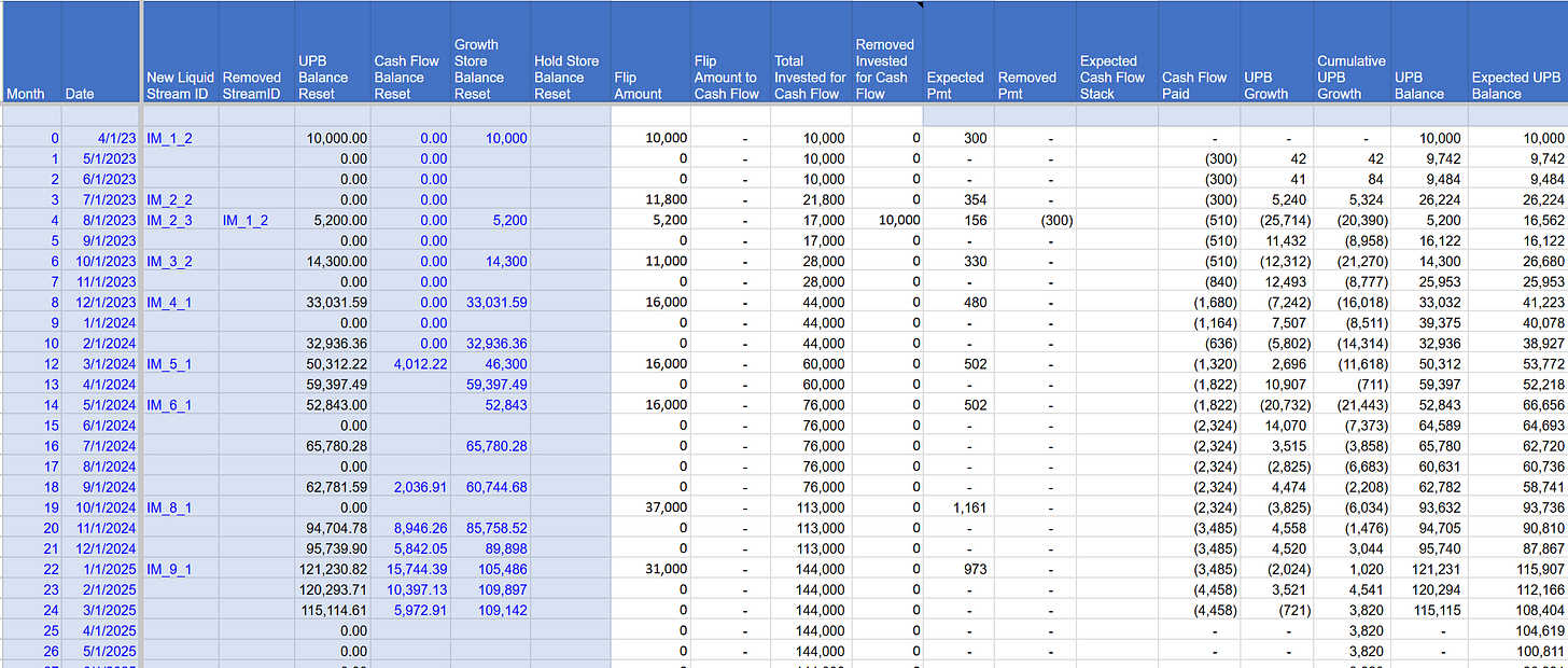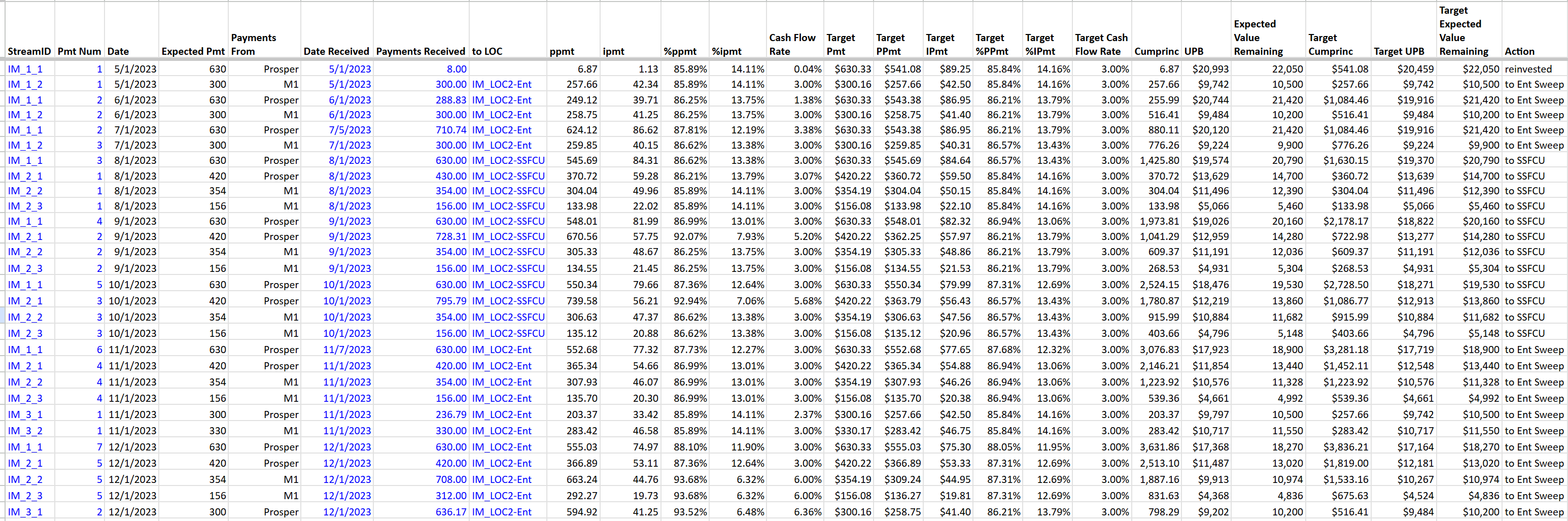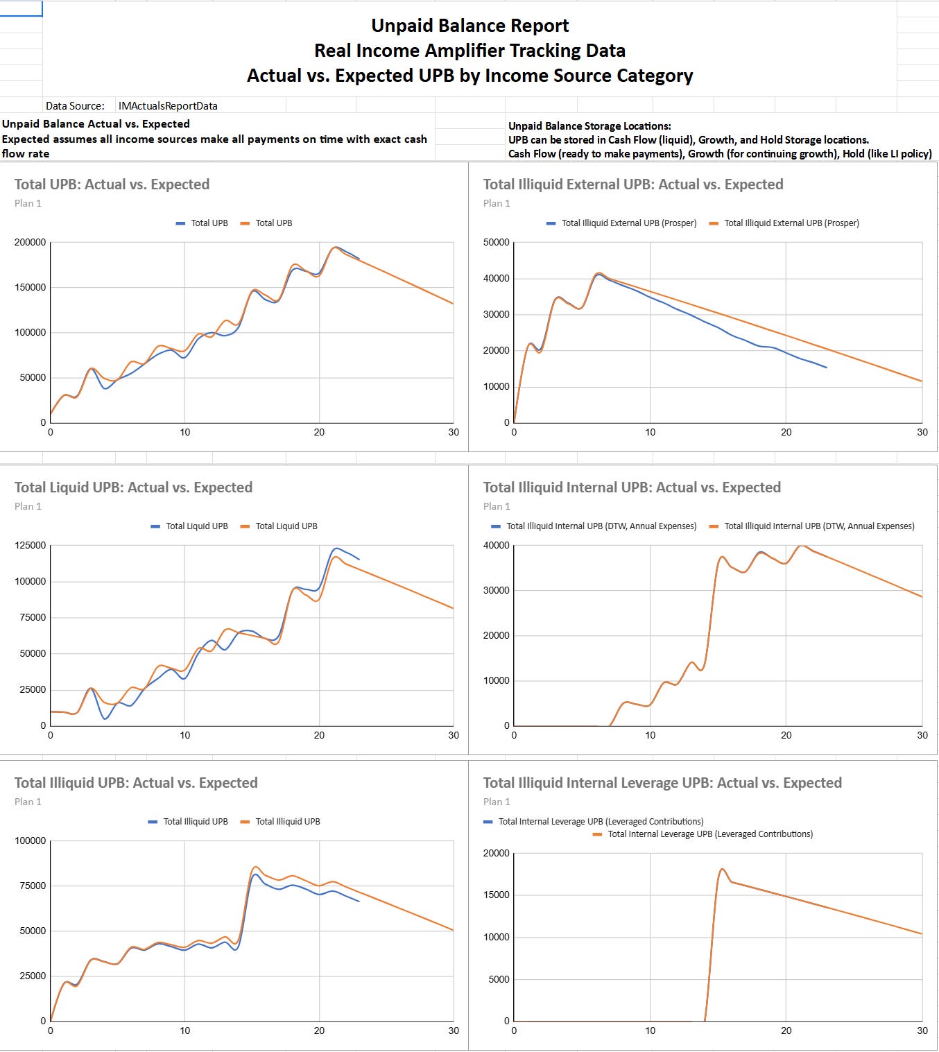 Complete tracking of actual UPB balances by category. For example, M1 and Prosper balances change based on markets or rates or defaults, etc. So you can see if your UPB is above or below what you would expect if payments and balance changes were proceeding perfectly.