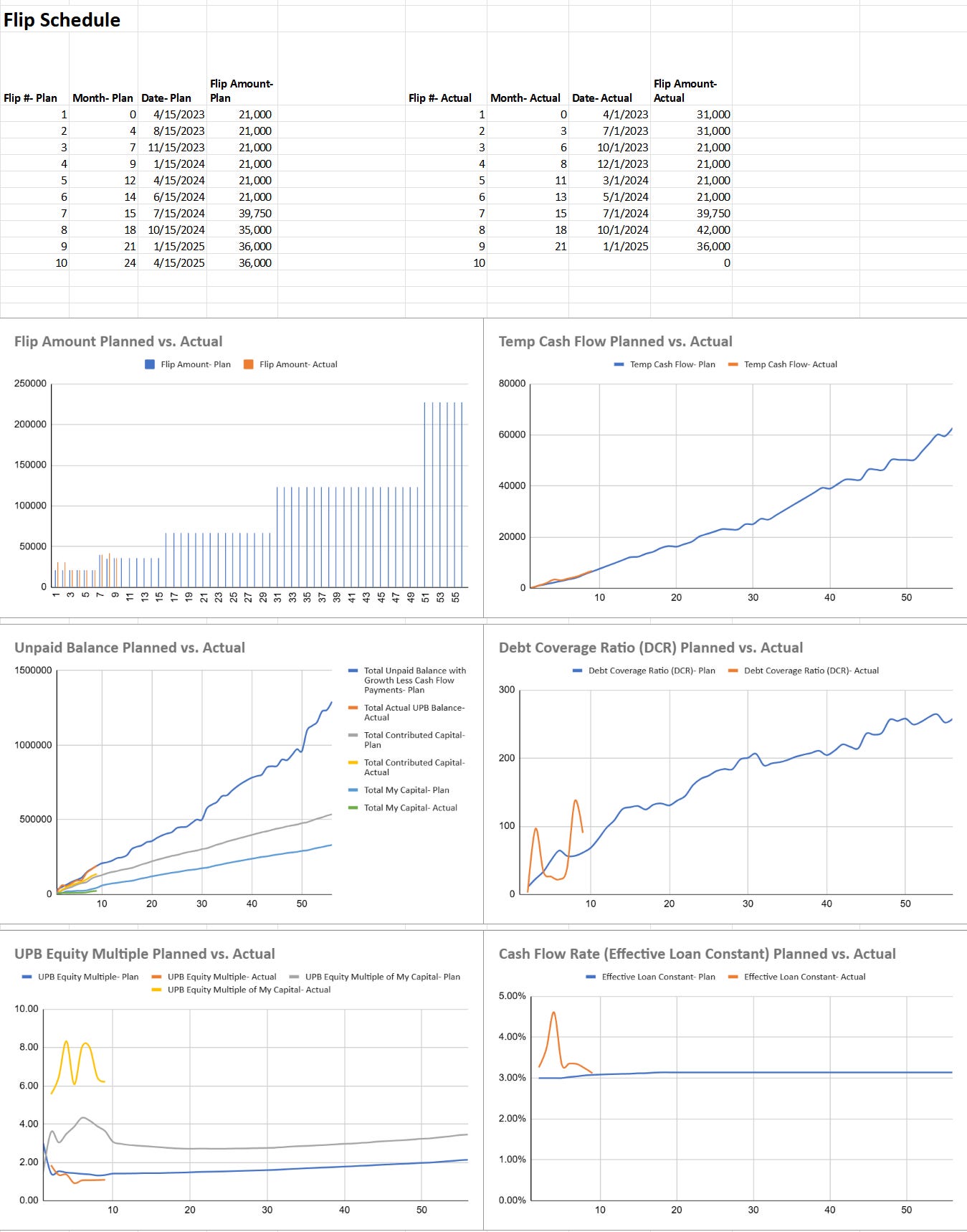 Model vs. actual charts for flip amount, temp cash flow, UPB, debt coverage ratio, cash flow rate, and equity multiple
